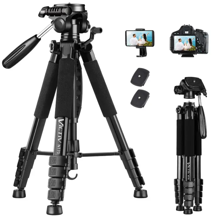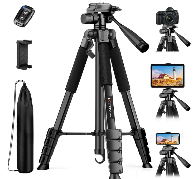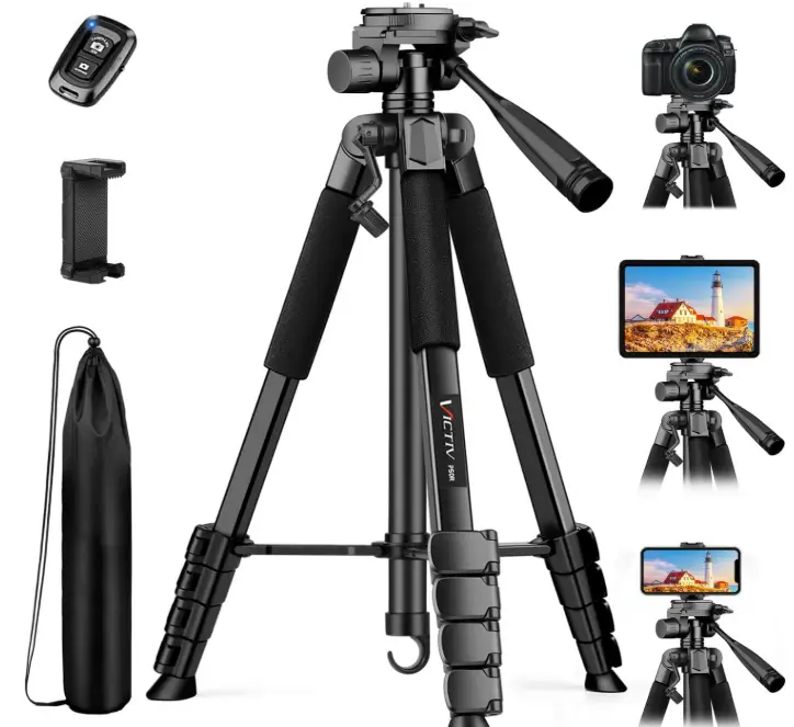 The VICTIV 74” Camera Tripod is a versatile choice for buyers who want one tripod that works with both cameras and phones, making it useful for photography, video recording, livestreaming, and travel. Its aluminum construction helps keep it lightweight enough to carry while still supporting gear up to 9.5 lb, and the included phone holder and carry bag add extra convenience right out of the box. It is compatible with DSLR cameras, iPhones, and even spotting scopes, so it is a practical option for users who need stable support across different devices and shooting situations