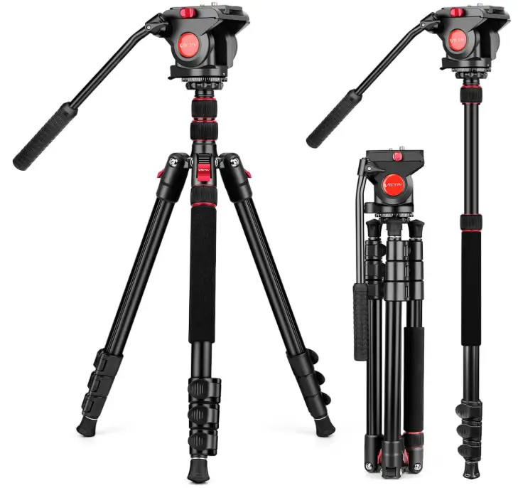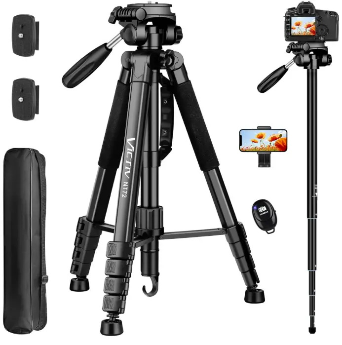 The Victiv 72″ Video Tripod is a practical choice for buyers who want smoother camera movement for video recording, thanks to its fluid head design. Its heavy-duty aluminum build offers stable support for Canon, Sony, DSLR cameras, and camcorders, while the monopod function adds flexibility for travel and active shooting situations. The included carry bag also makes it easier to transport and store, which is helpful for creators who need dependable equipment at home or on the go