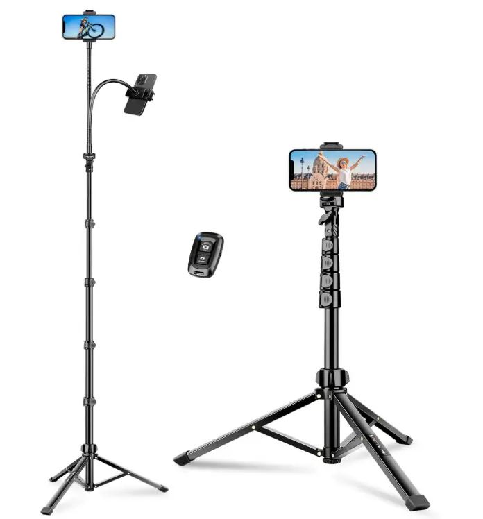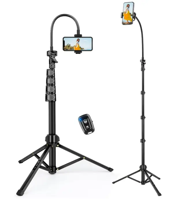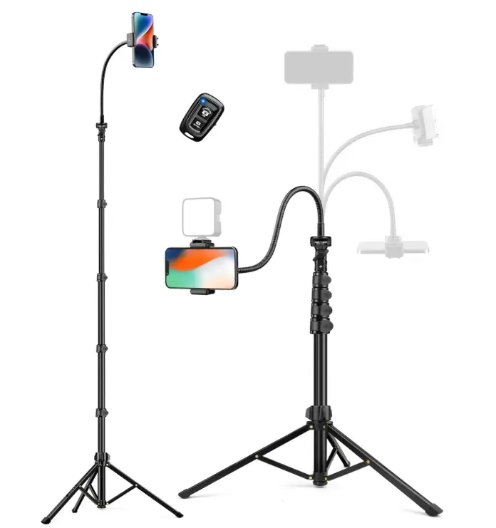 This 86″ tall tripod stand is a practical choice for buyers who want extra height and flexible positioning for recording fitness videos, cooking tutorials, vlogs, or hands-free viewing. The gooseneck makes it easier to adjust the angle for overhead or close-up shots, while the remote adds convenience for taking photos or starting recordings from a distance. Because it works with both smartphones and cameras, it is a versatile option for users who need one stand for different devices and everyday content creation