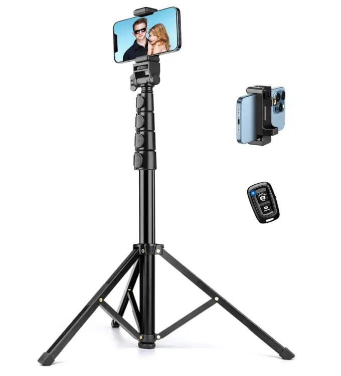 This 86″ tall phone tripod is a strong choice for buyers who want extra height for selfies, video recording, travel content, and hands-free viewing. The flexible gooseneck makes it easier to adjust angles for overhead, close-up, or eye-level shots, while the remote adds convenience for taking photos or starting recordings from a distance. Its portable aluminum design keeps it easier to carry, and compatibility with both iPhone and Android makes it a practical option for everyday use
