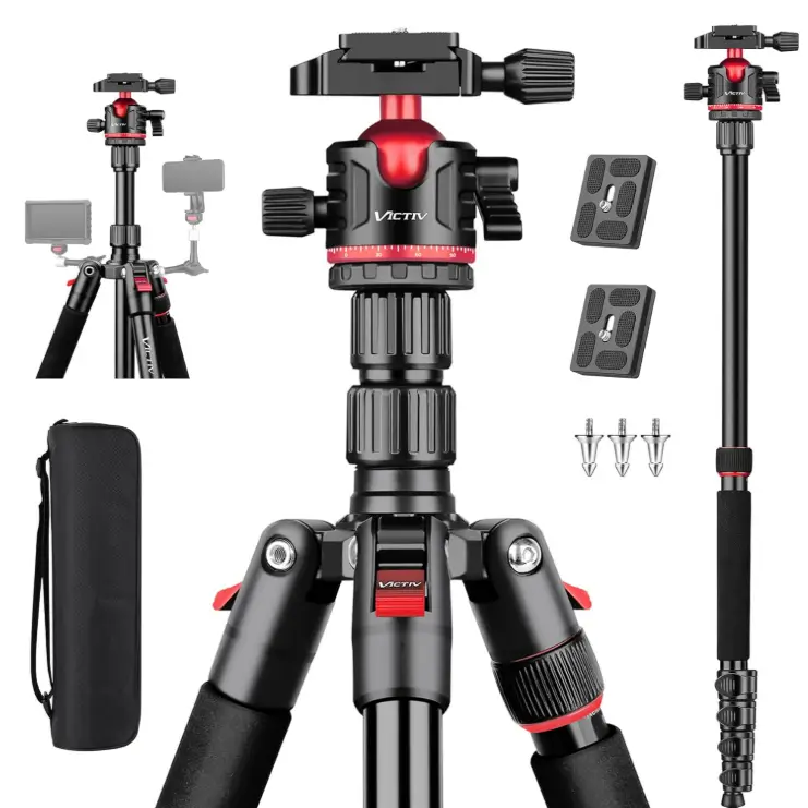 The Victiv 82″ Tall Camera Tripod is a great option for buyers who need extra height and strong support for photography, travel, and outdoor viewing. Its heavy-duty aluminum build helps provide stability for DSLR cameras, spotting scopes, telescopes, and binoculars, while the monopod function adds useful flexibility when moving between locations. This makes it a practical choice for users who want one professional stand for both shooting and observation in different environments