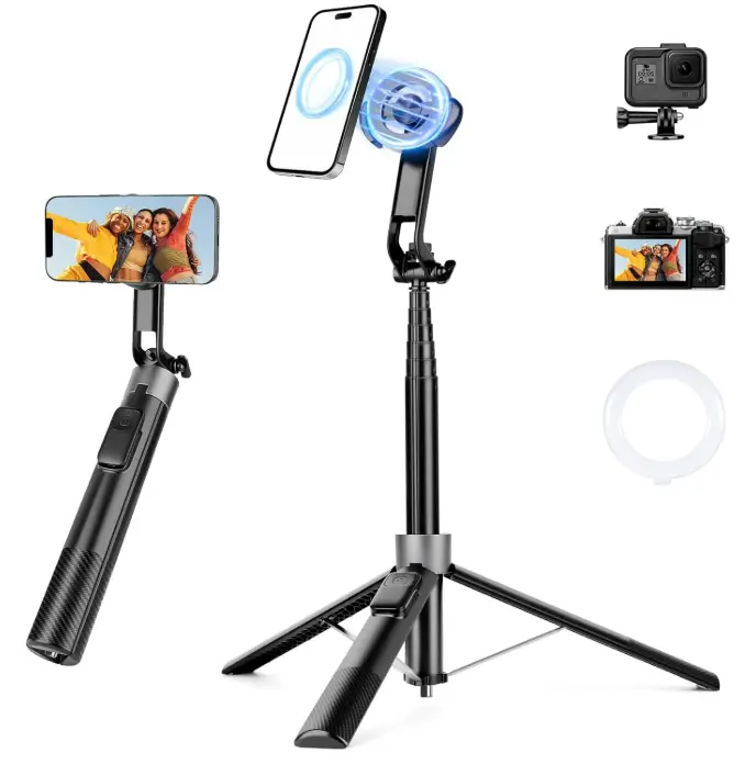 This 69″ magnetic phone tripod is a convenient choice for buyers who want a stable stand for travel, golf recording, selfies, and everyday video capture. The included stake helps keep the tripod more secure on outdoor ground, while the remote and 2-in-1 phone holder make it easier to shoot hands-free and switch between different setups. Compatible with both iPhone and Android phones, it offers useful flexibility for users who want one portable stand for both indoor and outdoor use